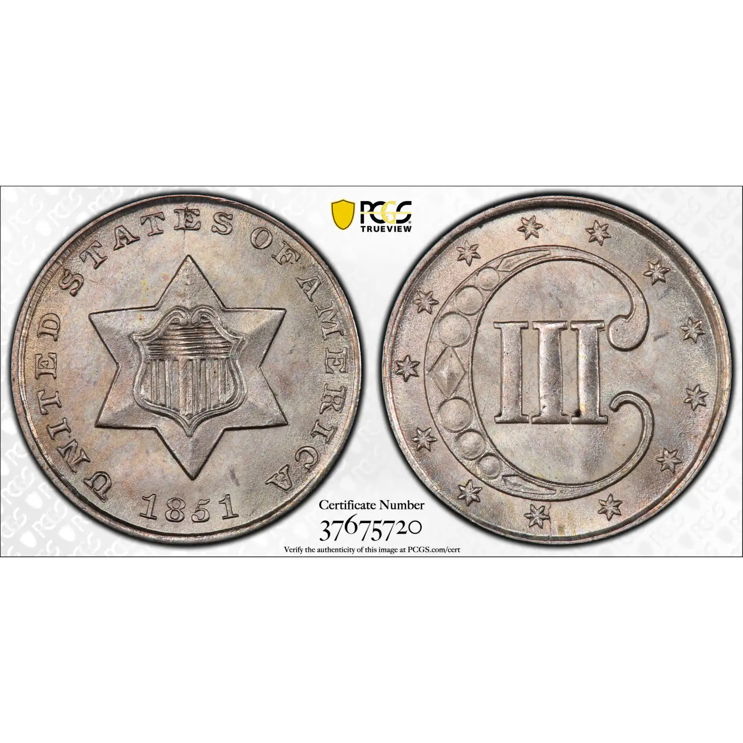 1851 Silver Three Cent Pieces - Trimes PCGS MS-67 Proof