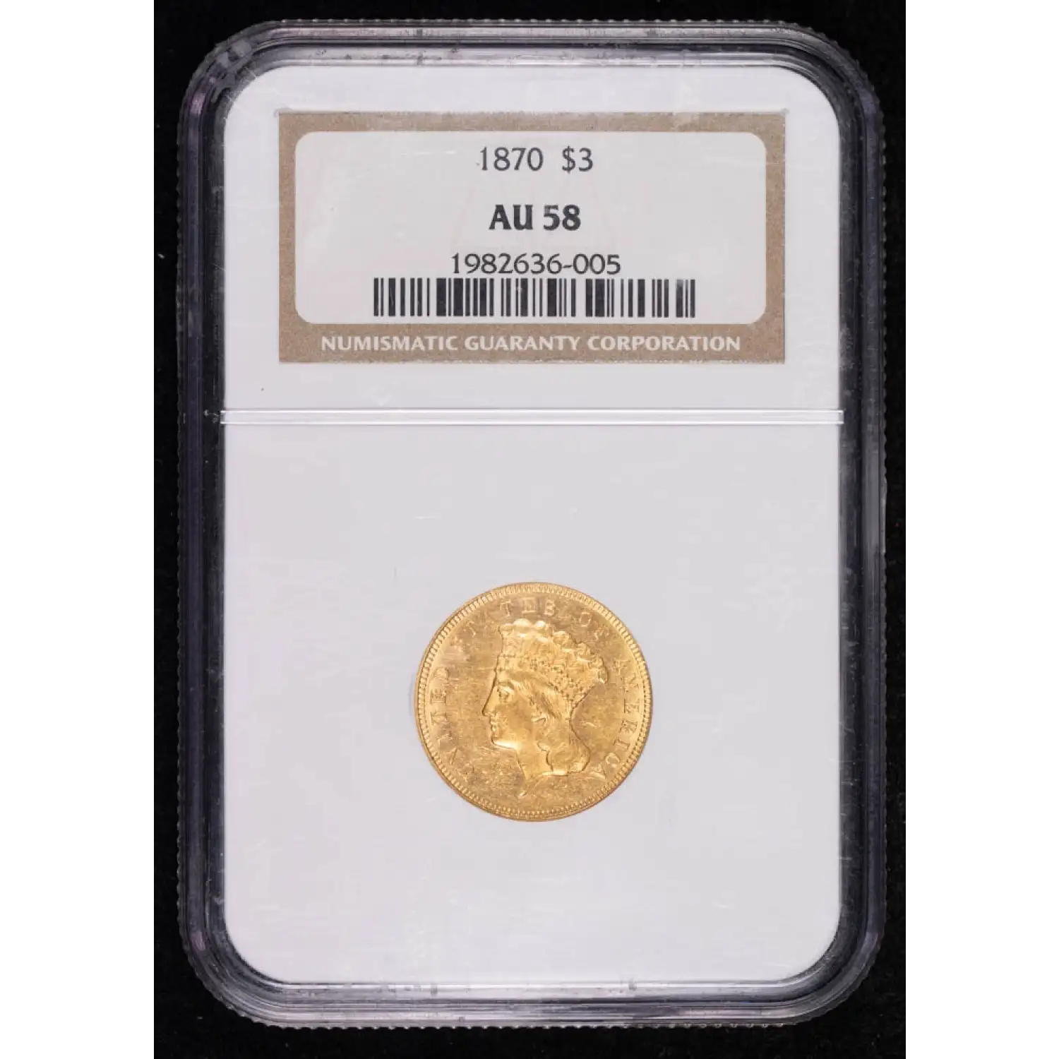 1870 Gold Three Dollars $3 Indian Princess Head NGC AU-58