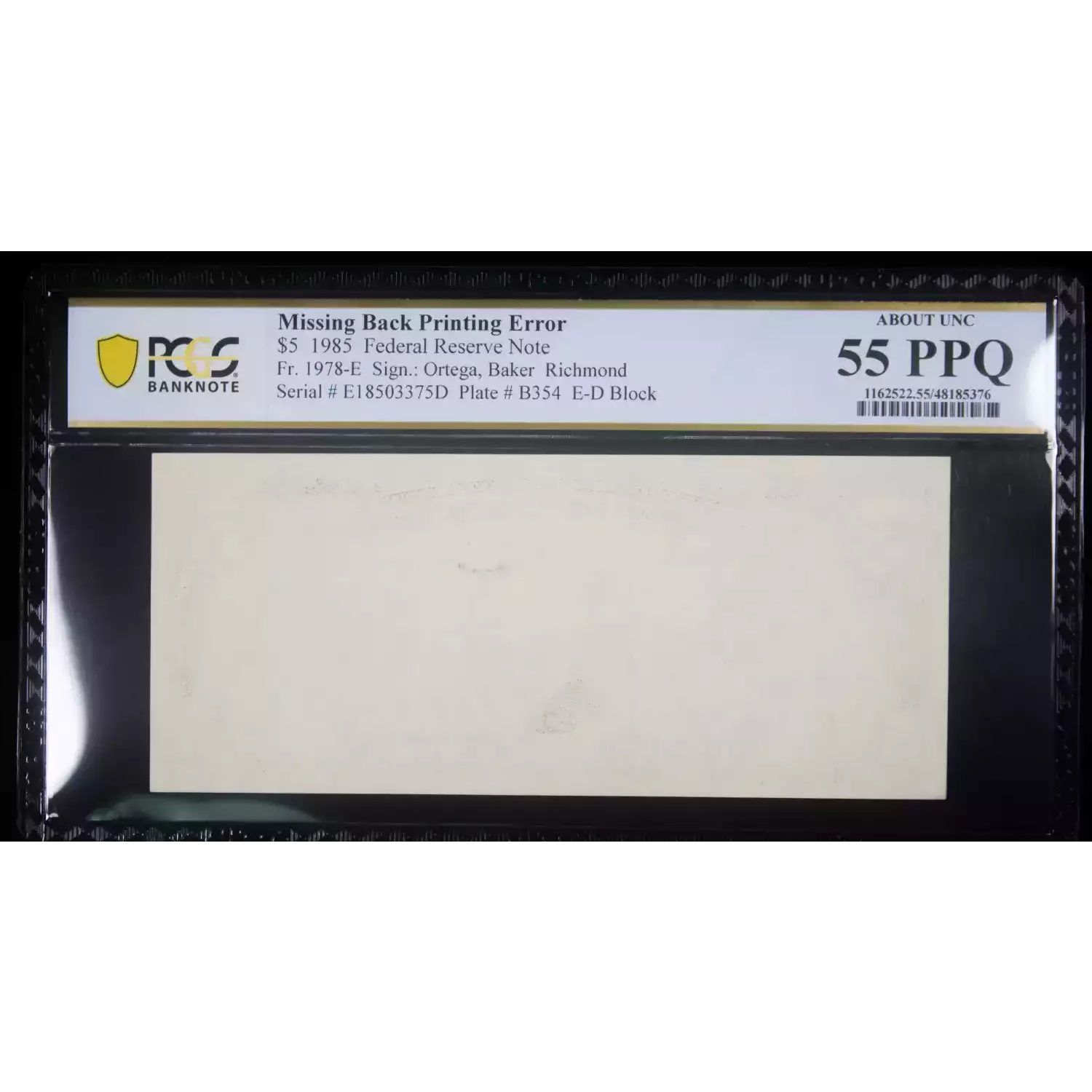 1985 $5 Small Size $5 Federal Reserve Notes 1978-E PCGS 55 Missing Back Printing Error