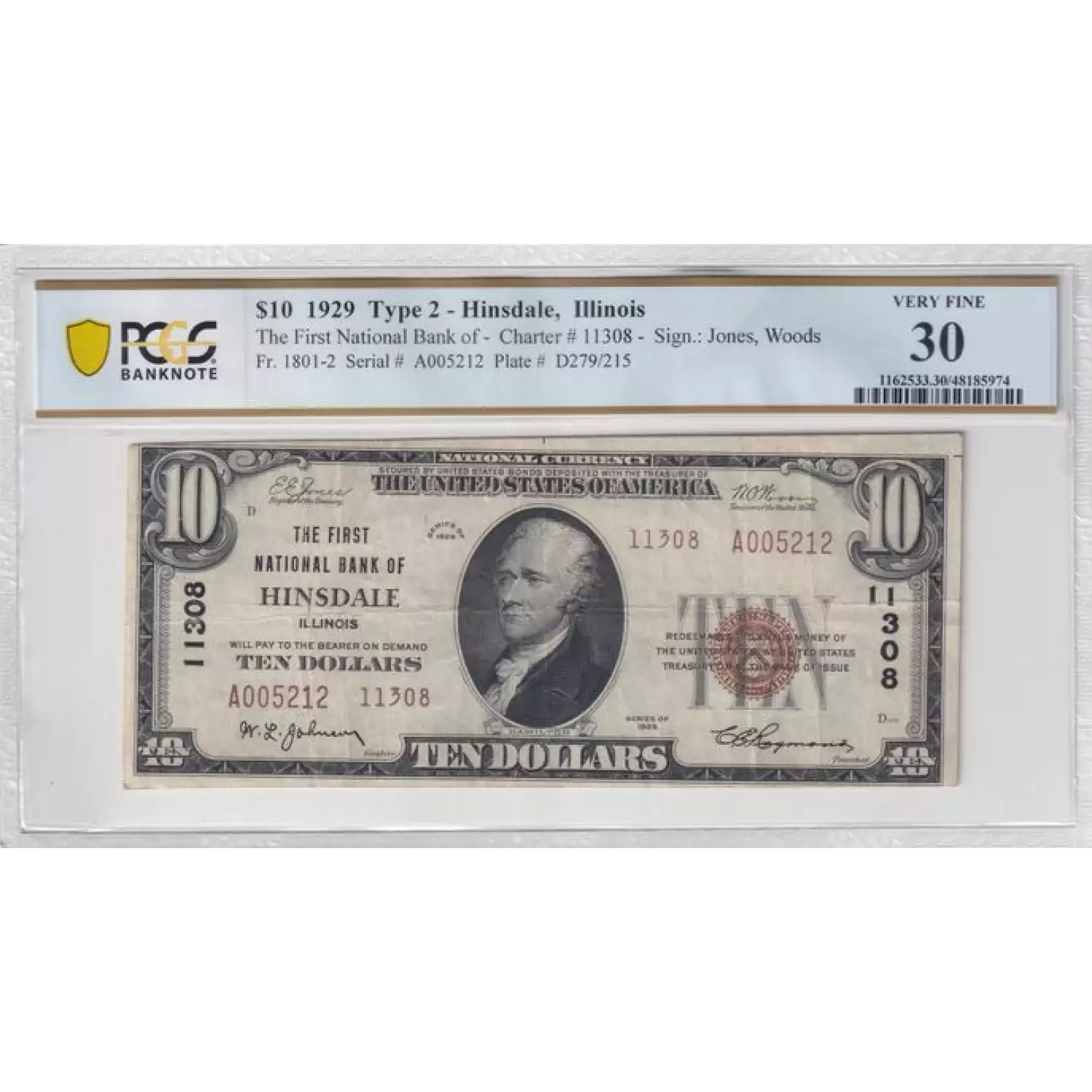 1929 $10 Type 2 Hinsdale IL Small National Bank Note Currency 1801-2 PCGS 30
