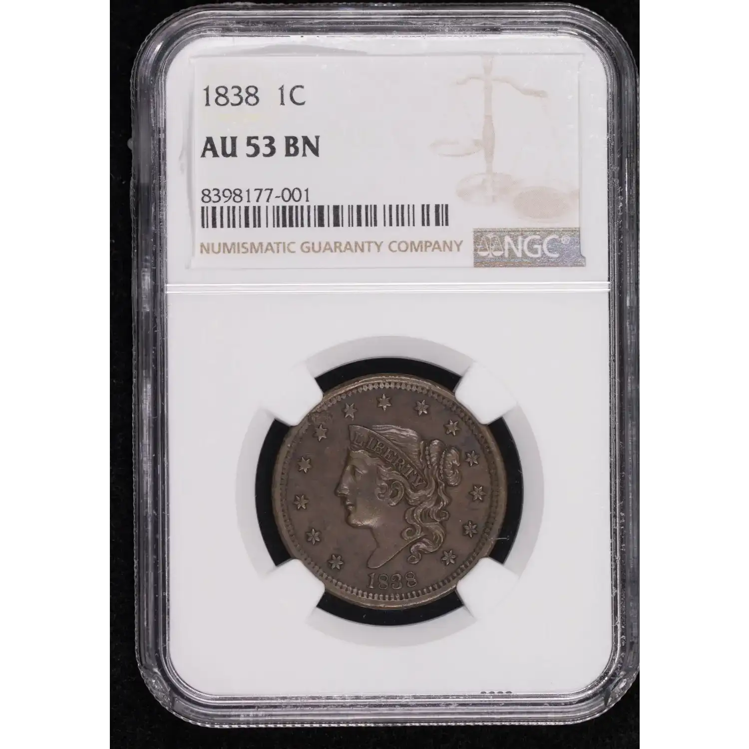 1838 Braided Hair Cent NGC AU-53 BN